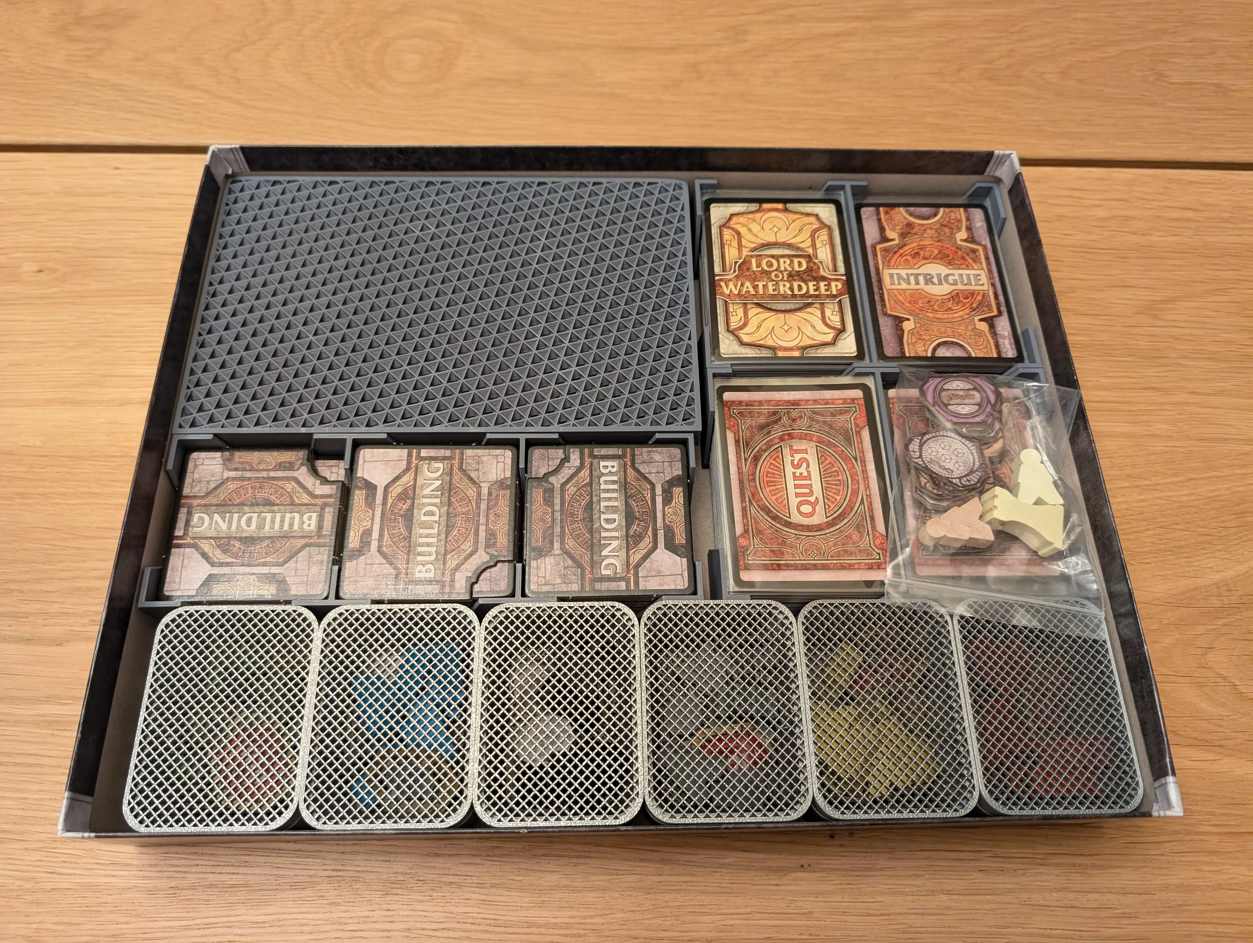 Transforme a organização do seu Lords of Waterdeep com este insert premium que comporta o jogo base + expansão Scoundrels of Skullport na caixa original. Produzido em PLA de alta qualidade com acabamento premium e gravações para identificação rápida dos compartimentos. * Slots individuais e identificados para cada tipo de carta (Edifícios, Missões, Intrigas) * Compartimentos dedicados para tokens de recursos sem misturar tipos * Organização vertical otimizada para acesso rápido durante o jogo * Espaço específico para armazenamento de edifícios * Bandeja ampla para componentes da taverna * Encaixe perfeito na caixa original sem desperdiçar espaço Acabe com sacos plásticos e cartas empilhadas - este jogo merece a organização premium que Waterdeep exige.